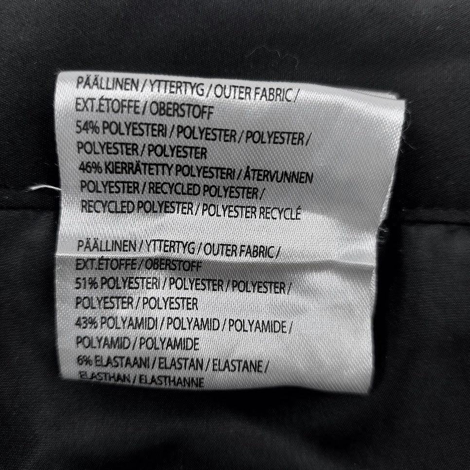54% polyesteri, 46% kierrätetty polyesteri (päällinen 1) / 51% polyesteri, 43% polyamidi ja 6% elastaani (päällinen 2)