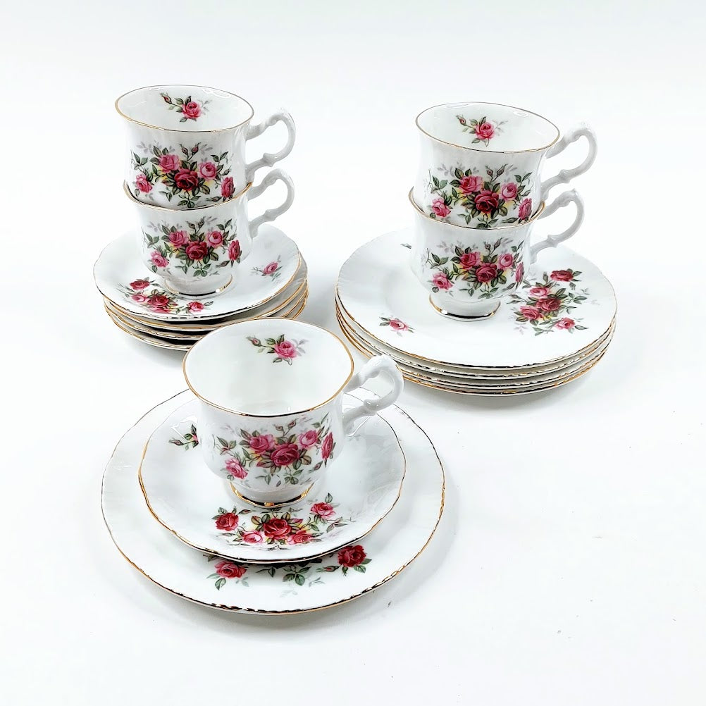 Sisältää 5 kahvikuppia, 5 aluslautasta ja 5 pullalautasta