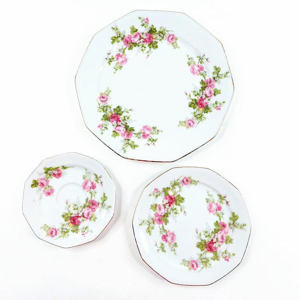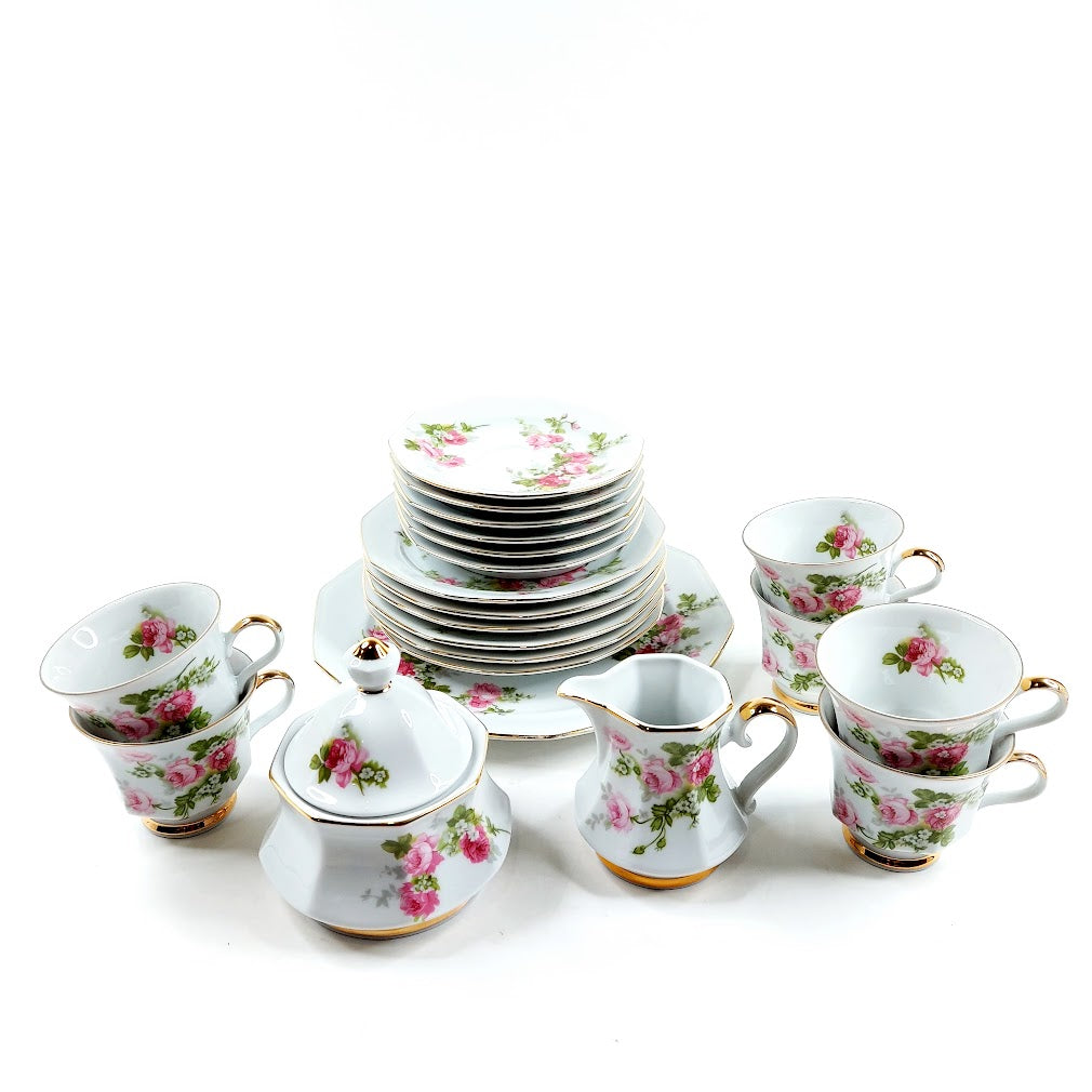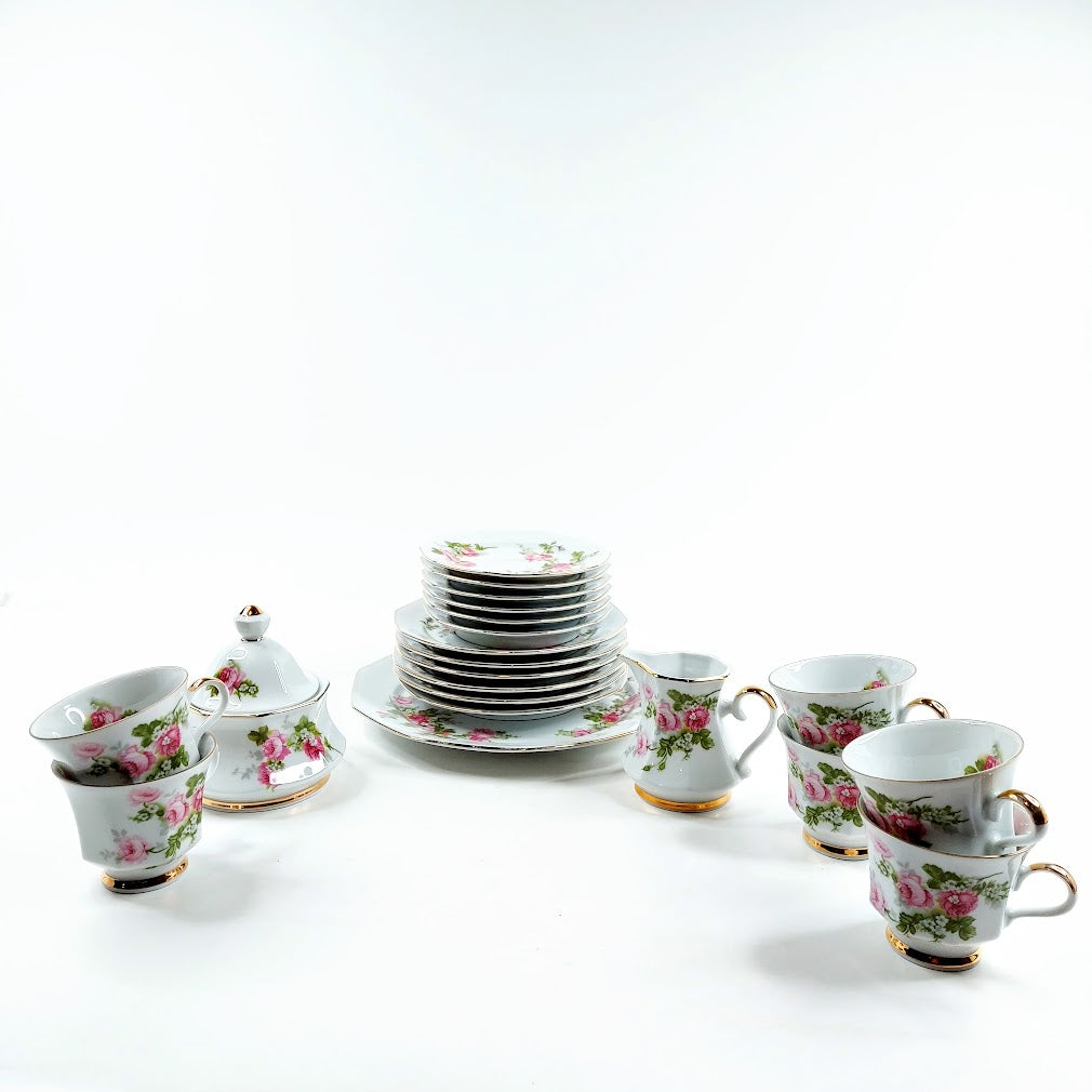 Sisältää; 6 kahvikuppia, 6 kahvikupin alusta, 6 pullalautasta, lautasen, sokerikon ja kermakon
